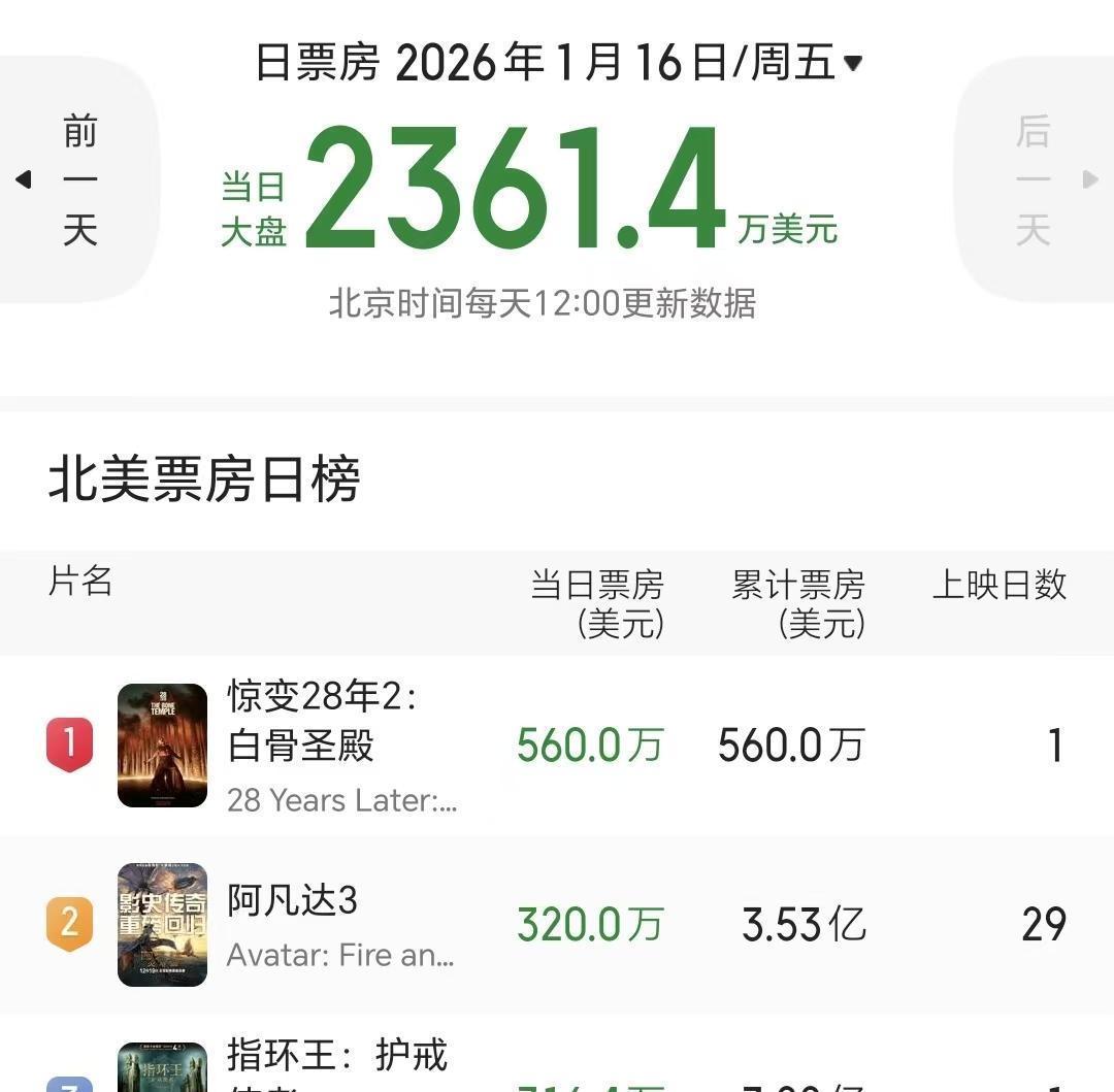 你没看错,就是那部前作口碑稀烂、评分不及格的《惊变28年》的续集。今年1月16日它刚在北美开画,首日就拿下560万美元,而同一天《阿凡达3》只收了320万。一部被寄予厚望、曾被预测能冲30亿美元的大制作,竟输给了这么个“烂片二代”,实在让人唏嘘。 更扎心的是,截至目前,《阿凡达3》全球票房才12.52亿美元,别说回本,连成本线都还没摸到。照这势头下去,最终恐怕连14亿都悬。这意味着,卡梅隆近三十年来第一次拍出亏钱的片子,也将是他导演履历上唯一一部票房垫底的作品。